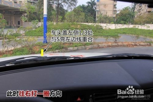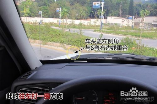 2、在进入S弯时,要注意车头的位置,尽量使车辆外前轮靠近弯道右侧边线行驶,用1挡半联动前进,前进过程中不能停车。前进过程中,还应观察左右后视镜,使车辆沿S路行驶。