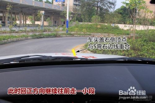 6、出弯:当车辆驶出S路,车头对准出口时,迅速回正方向,继续前行驶出曲线行驶考试区域。