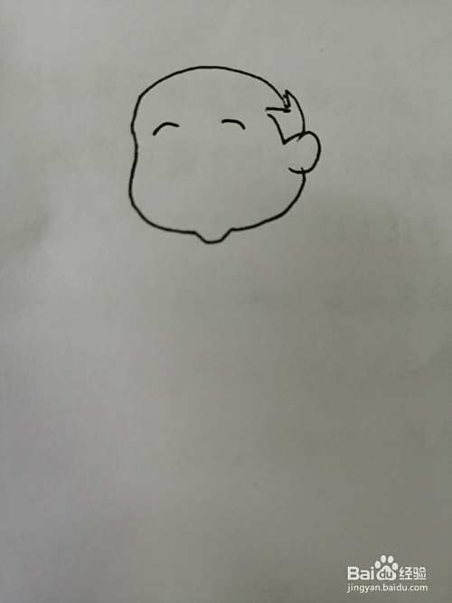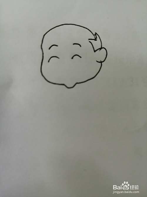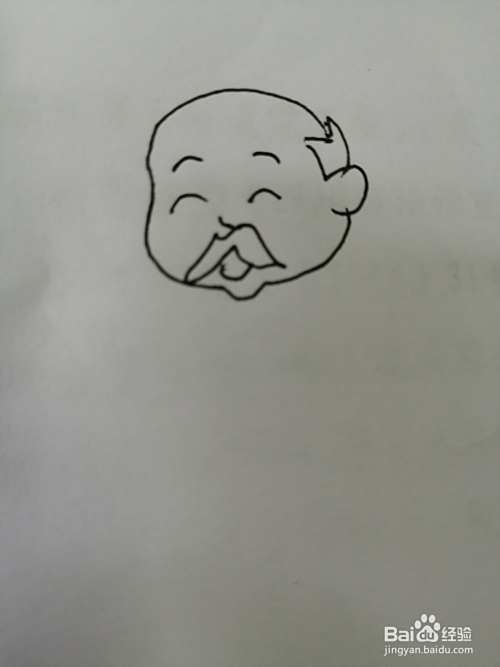 第二步,在慈祥的老爷爷的头部里面画出弯弯的眉毛和眼睛,老爷爷笑得很开心。