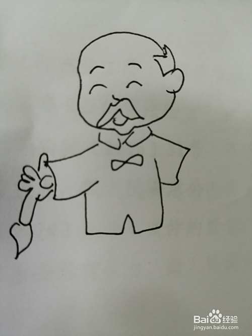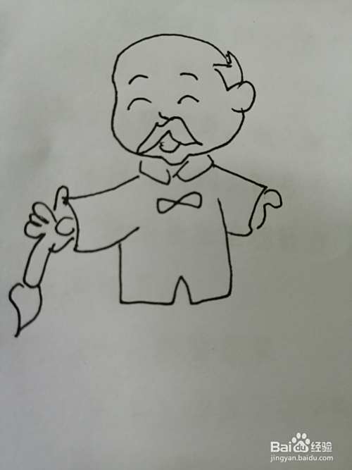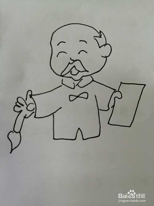 第五步,然后在慈祥的老爷爷衣服袖口的位置画出两只手,在左边手上画出一只毛笔。