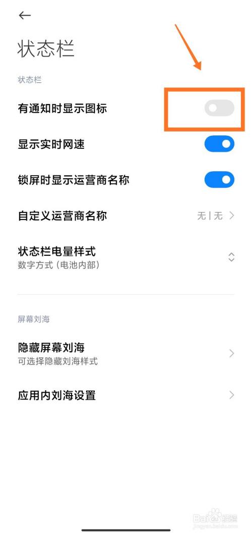 进入状态栏页面后,找到【有通知时显示图标】,关闭该设置。