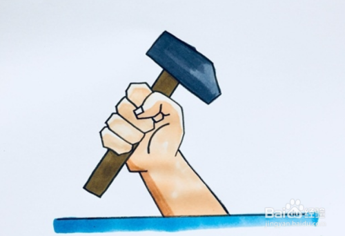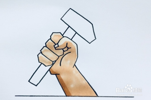 将锤子的头部涂成深灰色,手柄涂上棕色,再将水平线涂蓝,简单的劳动节就画好啦!