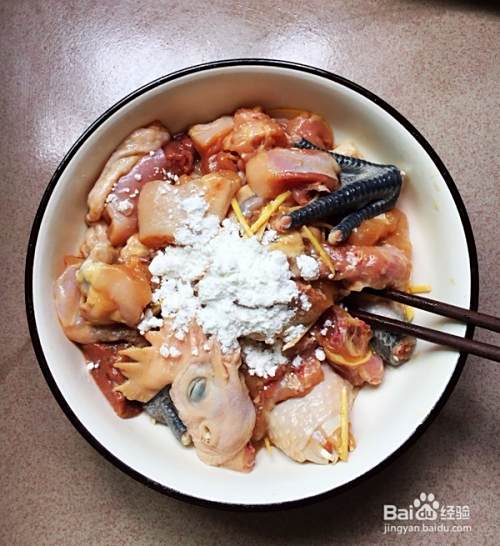 腌入味的鸡肉中加入玉米淀粉和食用油,拌匀。