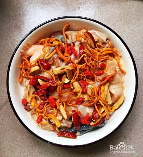 鸡肉表面撒上红枣丝,虫草花和枸杞子。