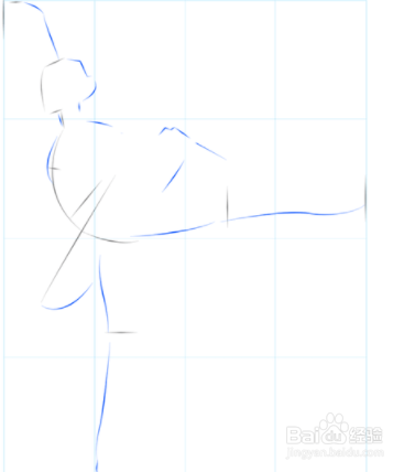 画出背面。为她的手添加线条,抬起的腿,标记她的手和手臂的比例。