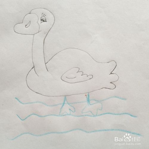 第五步:画出天鹅的眼睛、嘴巴及在清水中游泳的海浪,如下图所示。