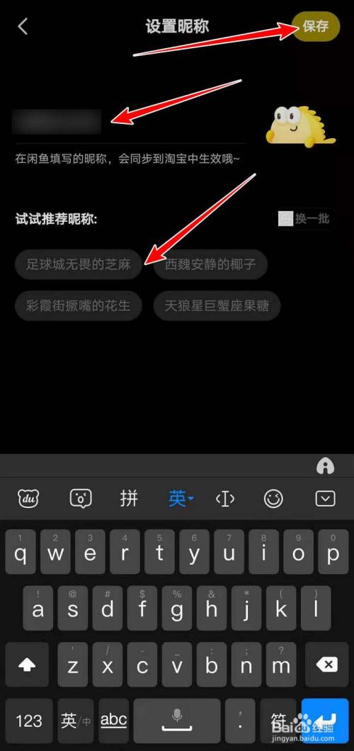 在设置昵称页面,自己输入或点选推荐昵称,再点选右上角保存;