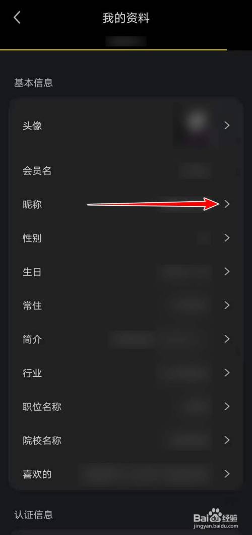 在我的资料页面,资料项目很详细,点选昵称右侧箭头;