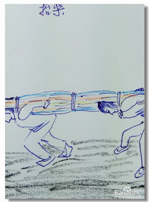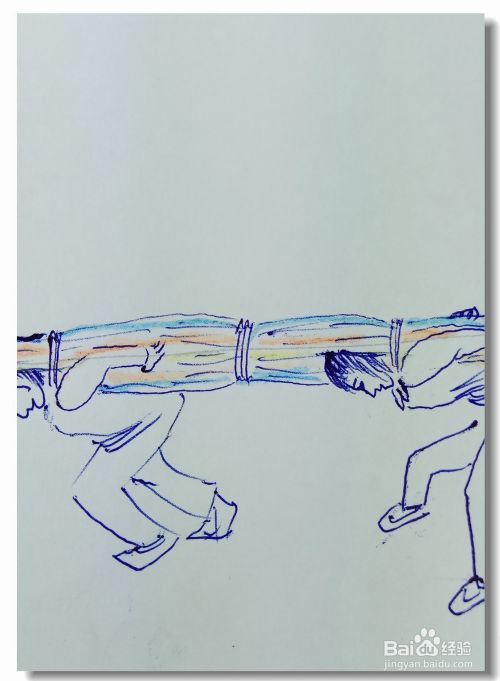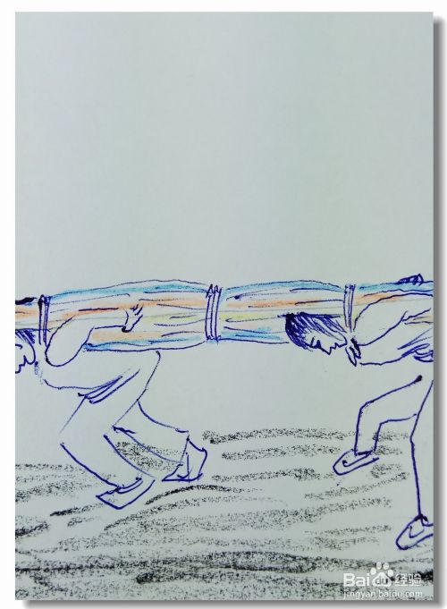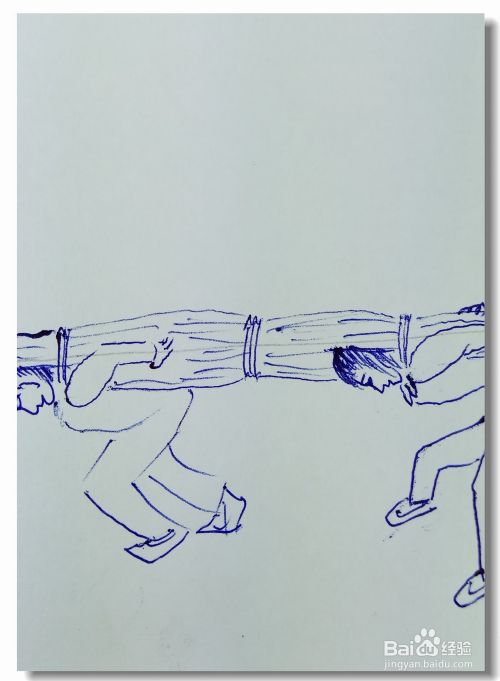 在白纸上画出另外一个人的头部轮廓和他的身体部分,他的身体呈90度角,两个人正背着一捆柴。
