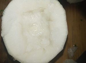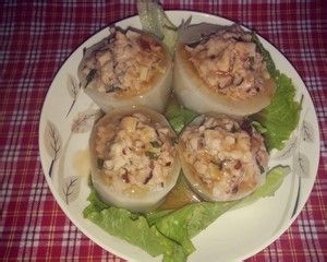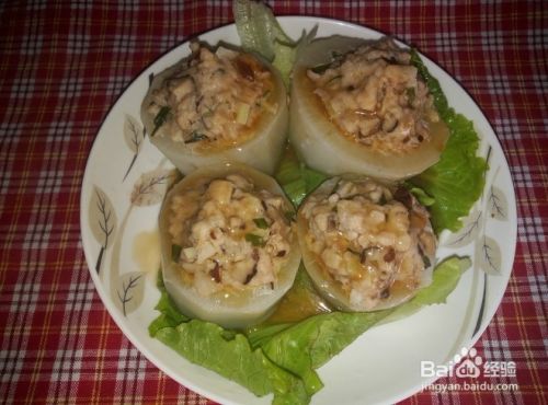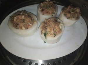 把适量的馅料放入挖好的萝卜块中,把做好的萝卜酿放入碟子中,上锅蒸10~15分钟,计时是从水蒸气冒上来开始计算。时间一到就可以把萝卜酿拿出来备用,这些材料可以做8个萝卜酿。但是由于我是一人食,所以我只蒸了一半