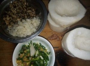 荸荠和泡软的香菇,姜剁碎,葱切花备用