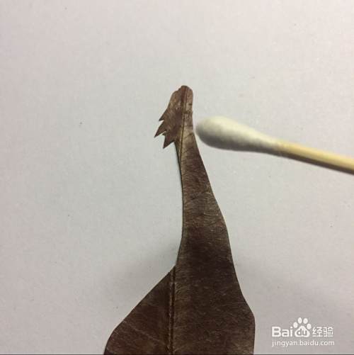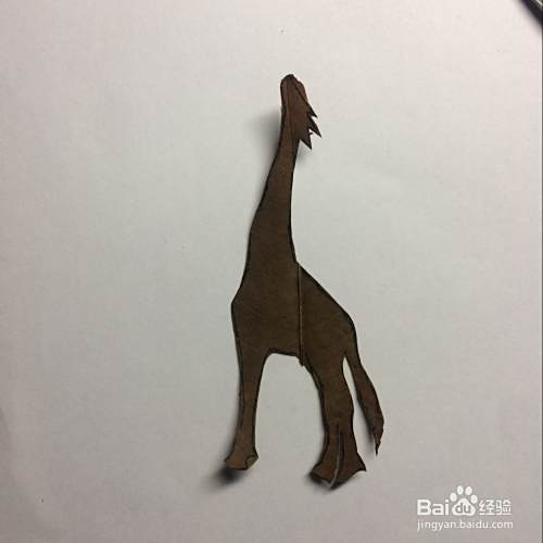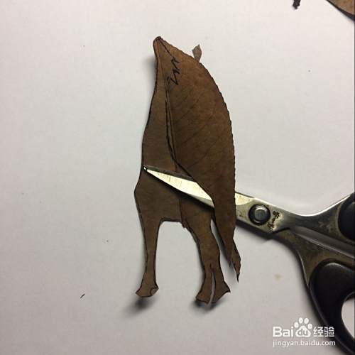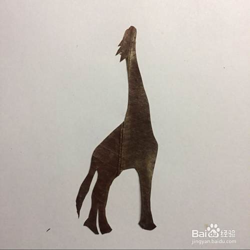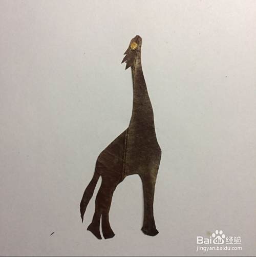 把叶子翻过来,看看剪的长颈鹿的轮廓像不像,如果还行就继续下面的工作,如果觉得不好,就重新再剪一个,反正捡回来的树叶也有很多的。