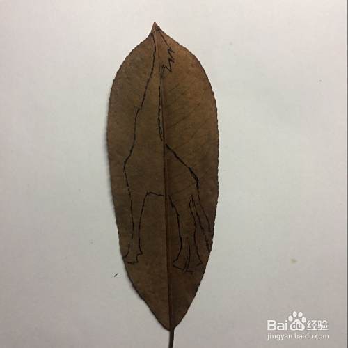 在树叶的反面,画上长颈鹿的形状,用剪刀沿着画好的线剪下来。