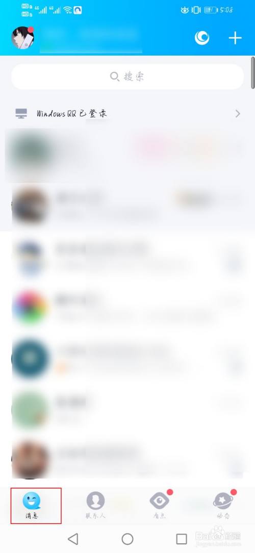 打开手机上的QQ,进入QQ的主页面(消息页面)