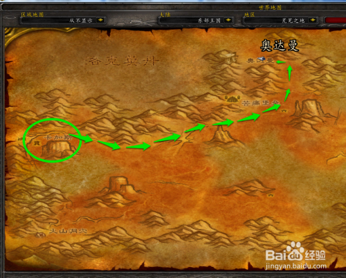 到达奥格瑞玛后,点击地图查看荒芜之地的卡加斯部落营地在东部大陆的位置。