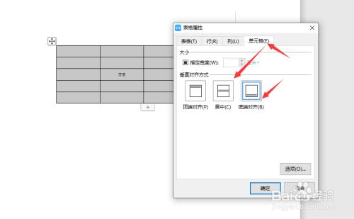 选中表格,打开右键属性栏中表格属性设置,在单元格面板中可修改垂直对齐方式样式,如图所示。