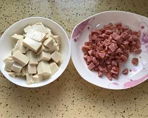 豆腐、火腿肠,切块,火腿肠切小块。葱、蒜,切碎。