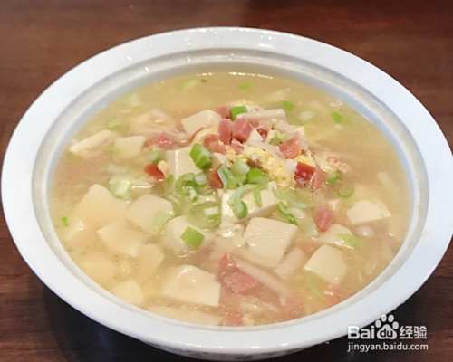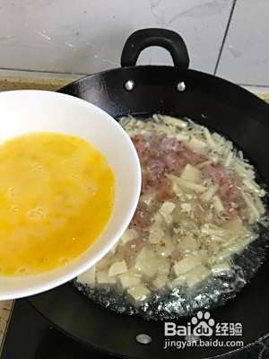 加入豆腐、火腿块,煮沸后,放入蛋液,倒入后迅速搅拌,打散蛋花。加适量盐,可以尝一下口感,适当添加。