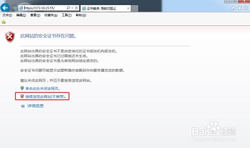 用电脑web浏览器登录idrac,输入idrac的IP地址,敲回车键,提示:安全证书问题,点击继续浏览就行了,如图所示: