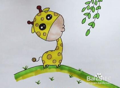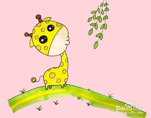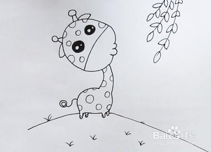 再画一个地面,长颈鹿的头顶画出一些柳条,地面画出些许小草