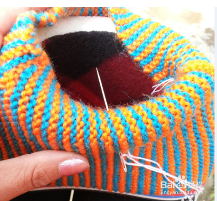 毛线鞋面和鞋底的缝合,先把织好的毛线鞋面翻过来,倒下口怎样围来鞋面上。两头中间都要用线缝住,这样是固定毛线,以防错位。