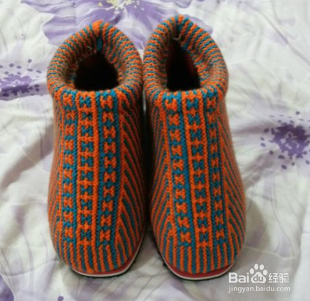 一直减至40针后吧就不加不减两色各织15排织完,然后把后跟部分用针线缝好,鞋面就做好了。