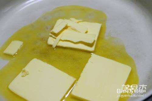 3黄油放不粘锅中小火慢慢融化,待沫央融化后,加入水混合均匀