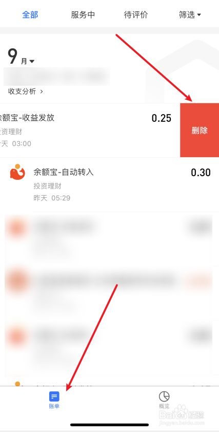 最后在账单界面,选择服务中的订单右拉点击删除即可。