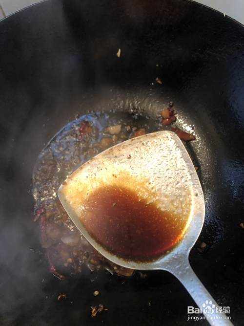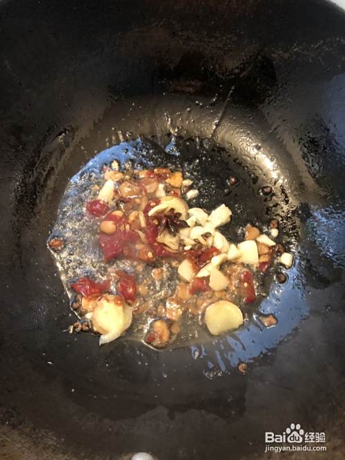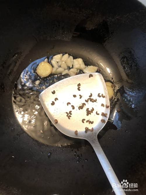 在锅中放入3g色拉油,加入姜、蒜、花椒;