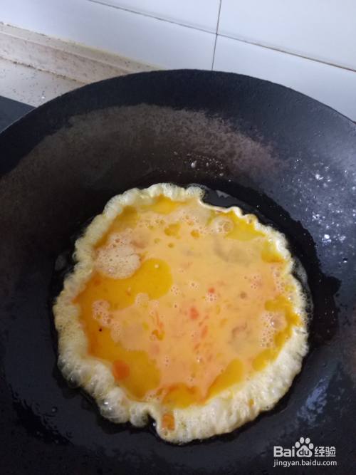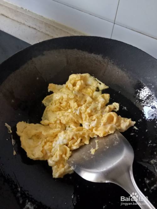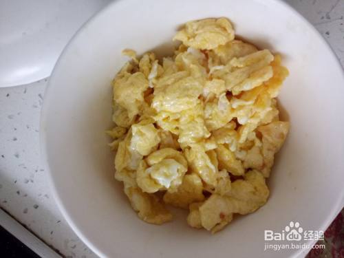 炒锅预热后加入适量的油,油温升起后倒入鸡蛋液,翻炒成块后盛入碗中。