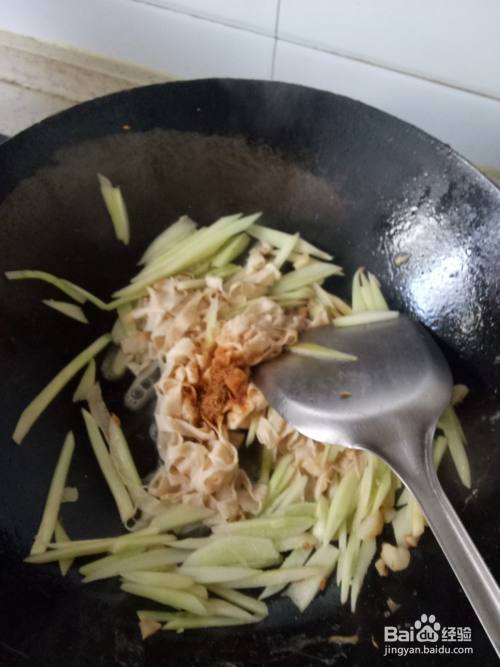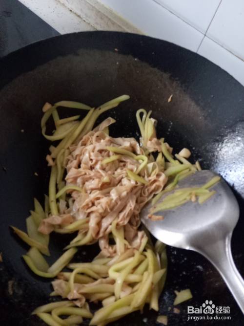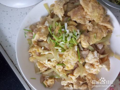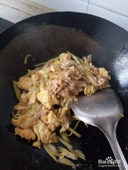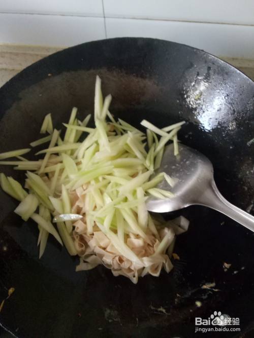 炒锅内再次加入适量的油,炸香大蒜后倒入黄瓜丝和豆皮丝,翻炒几下后调入适量的眼部、南德、生抽翻炒均匀。待翻炒至菜快熟的时候倒入鸡蛋块,翻炒均匀就可以盛出装盘了。最后撒点葱花点缀一下就可以开吃了。