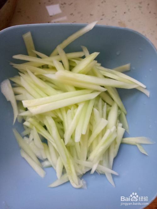 香葱择好洗净后切成葱花。干豆腐皮提前一会浸泡在水中,清洗干净后控干水分。黄瓜去皮后切成细丝。大蒜剥好后切碎。鸡蛋洗净蛋壳后打入碗中,搅拌均匀。