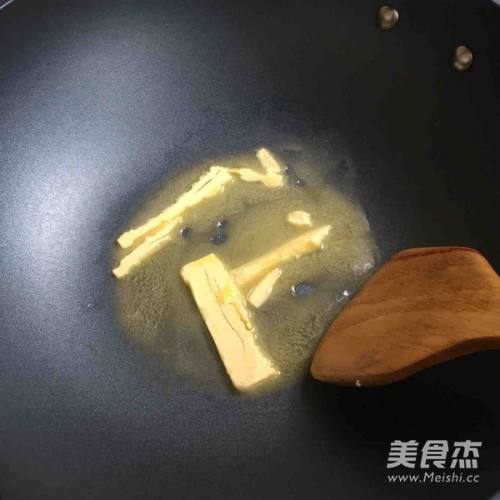 2小火加热溶化黄油。一定要选不粘锅,没有不粘锅,电饭锅内胆也可以的。因为棉花糖融化后会非常非常黏。