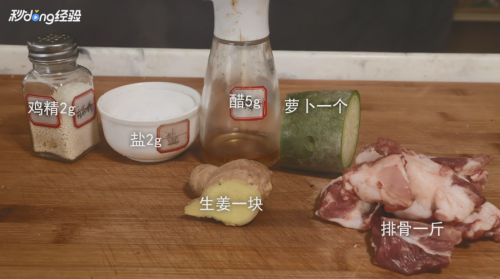 鸡精2g,盐2g,醋5g,萝卜一个,生姜一块,排骨一斤。