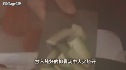 萝卜洗净切块,放入炖好的排骨汤中大火烧开。
