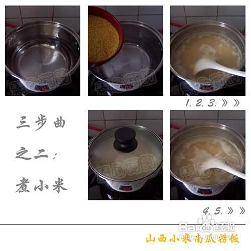 B.“三步曲”之二:煮小米,要遵循“开水煮、搅三搅,盖锅盖,开盖再搅三搅”的原则。就是必须要用开水煮小米,小米入锅后要用勺子搅拌小米,一定要搅拌三次,然后盖好锅盖,用大火将锅再次烧开,打开锅盖,再搅拌三次,目的是让小米入锅后不沉底。1.锅内放入足量的水,大火烧开。2.A部分泡好的小米放入开水锅中。3.用勺子将小米朝一个方向搅拌三次。4.盖好锅盖,大火再次把锅烧开。5.打开锅盖,用勺子将小米朝一个方向再搅拌三次。