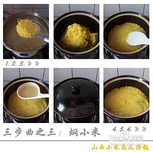 “三步曲”之三:焖小米。一定要用砂锅,文火焖煮,焖出来的米才香。1.用漏勺捞起小米,用手捻一下米粒,感到有硬心小米七分熟,就好了。2.用漏勺将小米捞起放在砂锅中。3.用小铲子将小米表面整平。4.用勺子舀入两勺煮小米剩下的汤。5.盖上锅盖,文火焖煮约5分钟左右。6.焖到小米熟无硬心就好了。
