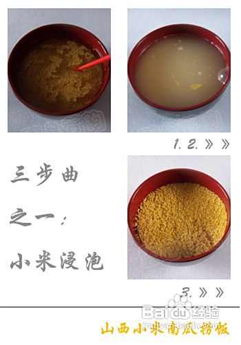 A.“三步曲”之一:浸泡小米,目的是让小米吸收水分,充分膨胀,增加其弹性。1.小米放在一个容器里,加入没过小米的水,用一根筷子搅拌几次。2.把水倒掉,重新加入没过小米的清水,浸泡10分钟左右。3.10分钟后,再次把水倒掉,留下小米备用。