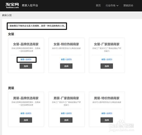 选择自己符合的行业角色,后并查看入驻规则,最后点击【选择】就可以了