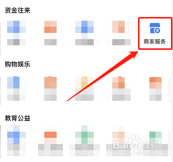 在全部应用中找到资金往来,再点击〔商家服务〕,如图所示: