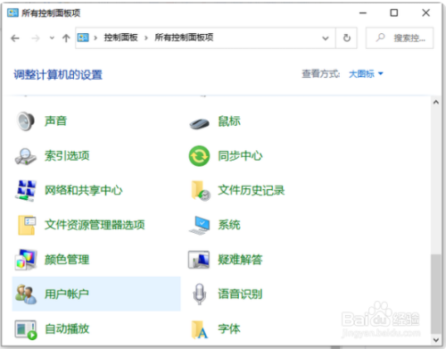 02.在控制面板界面,查看方式选择大图标,然后打开用户账户。