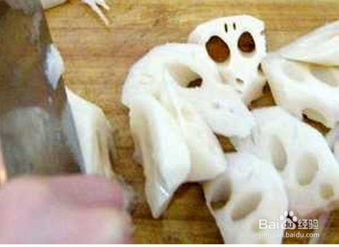 莲藕洗干净后,切成小块,要注意莲藕的孔洞里面是否有淤泥,斩块的莲藕用盐水冲洗并沥干水分。