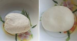 整成面团后粗糙的样子就行,盖子盖上醒面10-15分钟,然后揉成右边美颜后的样子,继续盖起来醒面,待其他料馅弄好直接用