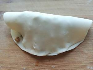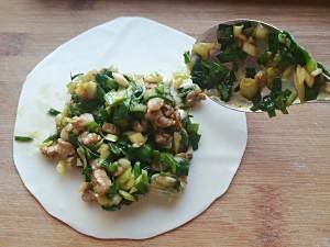 将弄好的韭菜肉丁馅料放入中偏下的部分,量自己看