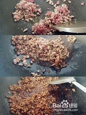 开炒肉臊子,油过了直接放入肉丁和生姜末,翻炒,放入适量花椒粉、料酒、老抽,时间不要太短继续翻炒让油煸出来点,颜色慢慢就变好看了,关火!