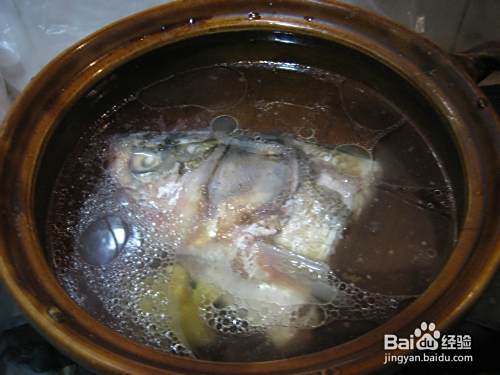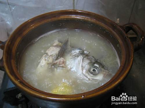 将煎好的鱼头连同锅内的油、姜一起倒入汤锅,汤锅内加入水淹过鱼头,加少许白胡椒粉。加盖,开小火慢炖10分钟。