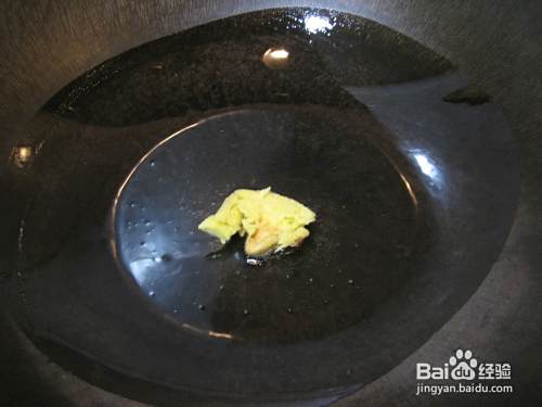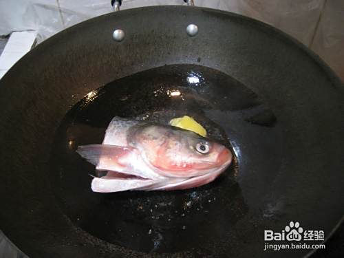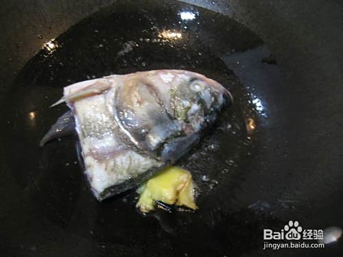 铁锅内加油,开中火,放姜块、鱼头煎。煎黄一面翻面煎另一面。