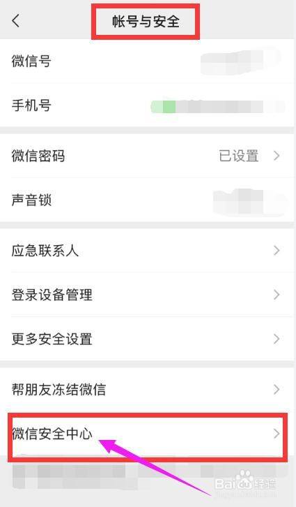 5进入“账号与安全”页面后,在该页面点“微信安全中心”。