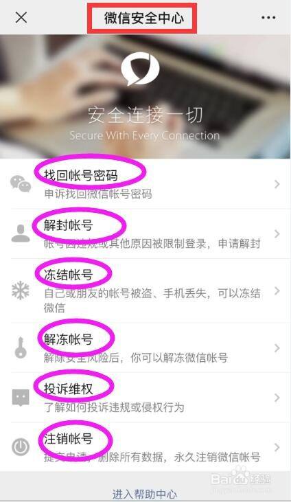 6进入“微信安全中心”页面后,在该页可以看到“找回账号密码”“解封账号”“冻结账号”等,平时有遇到这些问题的小伙伴们,就可以进入此页面解决。