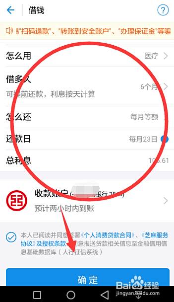 验证中会收到一个短信验证,将验证码输入对话框中,点击确定,借款成功后,等待到账即可。